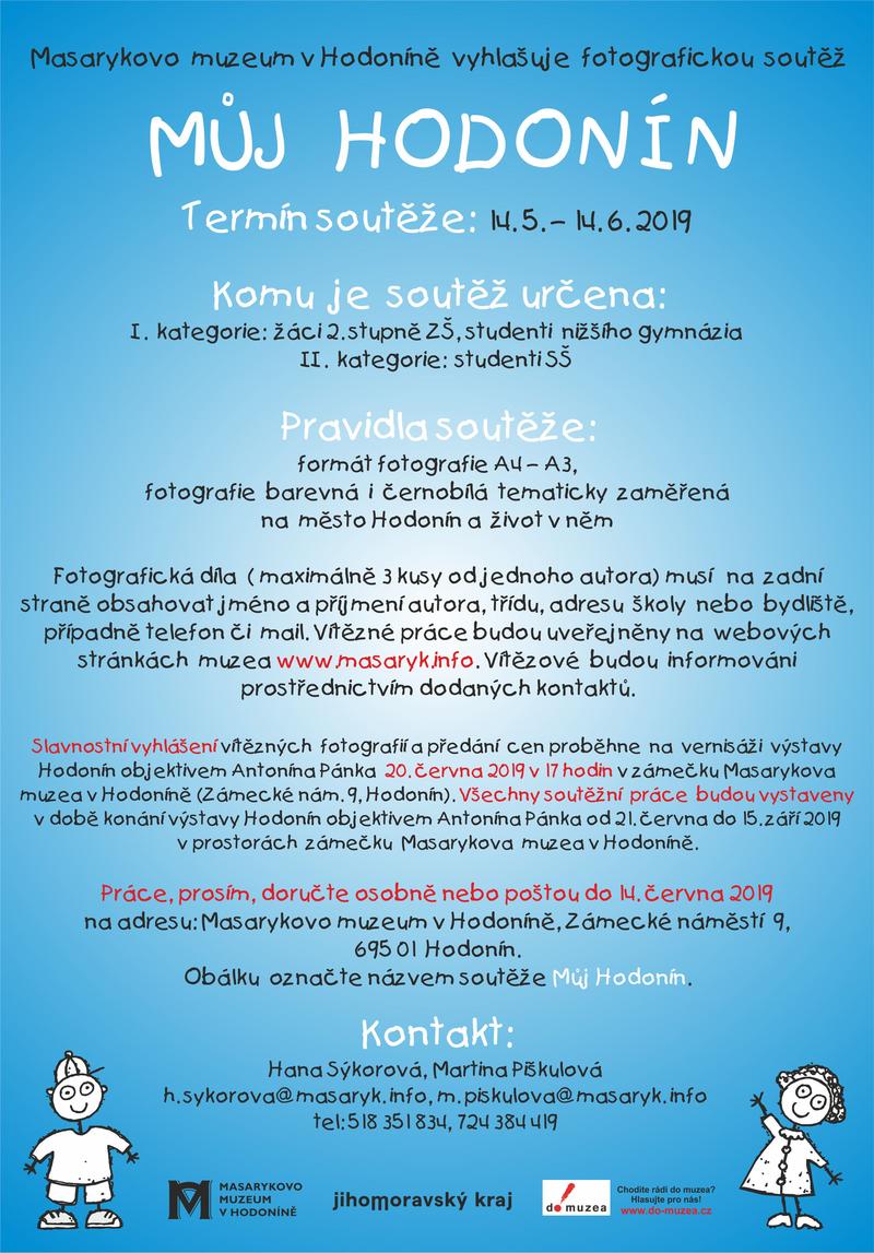 Masarykovo muzeum v Hodoníně vyhlašuje fotografickou soutěž pod názvem ''Můj Hodonín''. Soutěž je určena žákům II. stupně ZŠ, studentům nižšího gymnázia a studentům SŠ. Termín soutěže je od 14.5.-14.6. 2019.