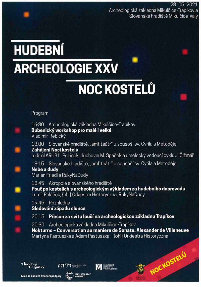 Komponovaný večer v areálu Slovanského hradiště v Mikulčicích a na archeologické základně Trapíkov. Akci zahájí bubenický workshop a poté naváže koncert lidové hudby. Pouť po kostelích bude doplněna vyprávěním o jejich významu a archeologických okolnostech nálezu. Po západu slunce uzavře program hudební nokturno na archeologické základně na Trapíkově.