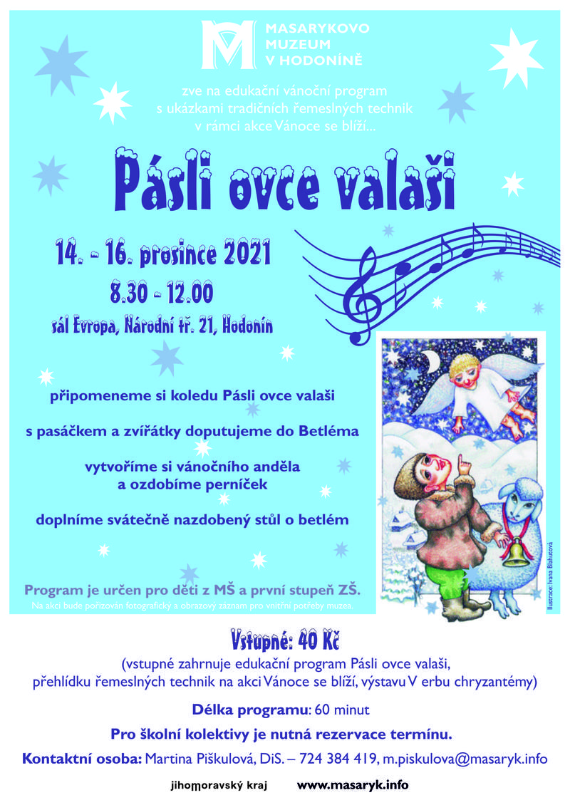 Třídenní akce doplněná o doprovodné pásmo na téma Pásli ovce valaši. Masarykovo muzeum v Hodoníně jako již tradičně pořádá vánoční akci s přehlídkou řemeslných technik v sále Evropa. Pro děti z mateřský škol a žáky prvního stupně základních škol je připraven doprovodný edukační program Pásli ovce valaši. Děti si prožijí cestu do betléma společně s pasáčky a lidmi, kteří se šli poklonit Ježíškovi na základě známé lidové koledy. V programu budou děti vytvářet andělské prostírání, s pasáčkem třídit zatoulaná zvířátka, poputují klikatou cestou, na které musí ochránit své stádo, a nakonec dotvoří betlémem atmosféru vánočního stolu. V rámci programu si mohou prohlédnout řemeslníky, kteří budou pracovat se dřevem, nazdobit si perníček nebo obdivovat vánoční ozdoby ze šustí a korálků. Vzhledem k epidemiologickým nařízením je nutné, aby se skupiny objednávaly.