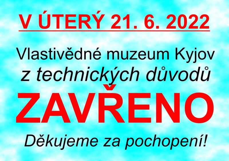V úterý 21. 6. 2022 bude pro návštěvníky Vlastivědné muzeum Kyjov z technických důvodů ZAVŘENO.