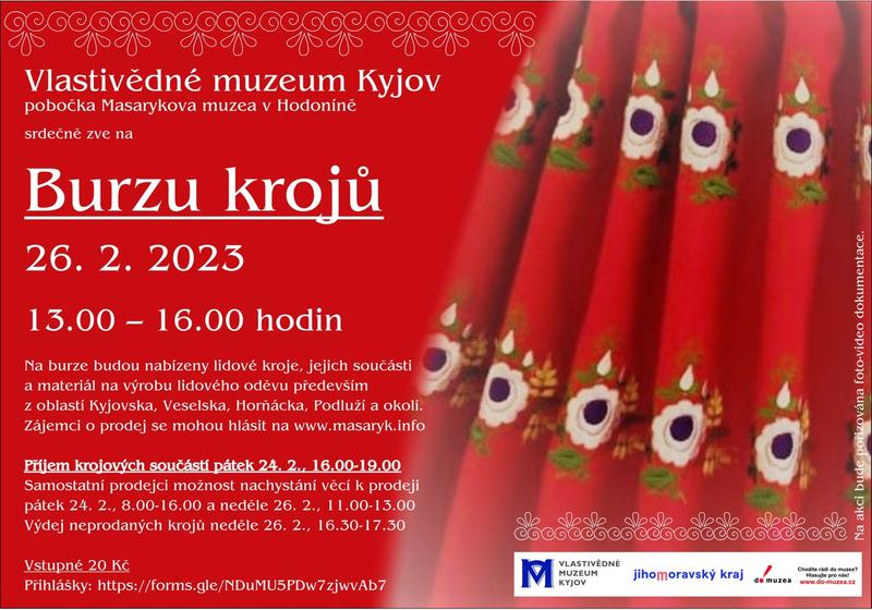 Srdečně zveme zájemce na Burzu lidových oděvů. Přijďte prodat krojovou součást, kterou nepotřebujete, nebo si přijďte vybrat tu, která vám doma chybí. Na burze budou nabízeny lidové kroje, jejich součásti a materiál na výrobu lidového oděvu především z oblastí Kyjovska, Veselska, Horňácka, Podluží a okolí. Burza krojů není určena pro komerční nákup. Přihlášky na rezervaci prodejního místa je nutné vyplnit zde: https://forms.gle/zcoCXiicctNu2PX98