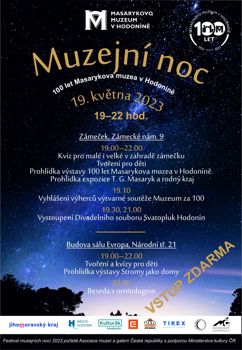 Masarykovo muzeum v Hodoníně zve na akci Muzejní noc 2023. Akce se uskuteční 19. května od 19.00 do 22.00 v zámečku muzea a v budově sálu Evropa.
