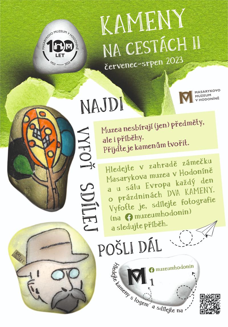 Muzea nesbírají pouze předměty, ale i jejich příběhy. U každého předmětu je pro nás důležitý jeho uživatel, výrobce, jeho "život" než se dostal do sbírek. Myslíte si, že i kámen může mít příběh? Určitě, ale je potřeba mu ho vytvořit. Přijďte si během prázdnin pro malované kameny do zahrady Masarykova muzea v Hodoníně a k sálu Evropa, vyfoťte je, sdílejte na náš FB, facebook.com/muzeumhodonin, pošlete do světa a sledujte příběh. Každý den se v průběhu července a srpna objeví na výše uvedených místech dva kameny s logem Masarykova muzea v Hodoníně. Přijďte hledat a vytvářet příběh...