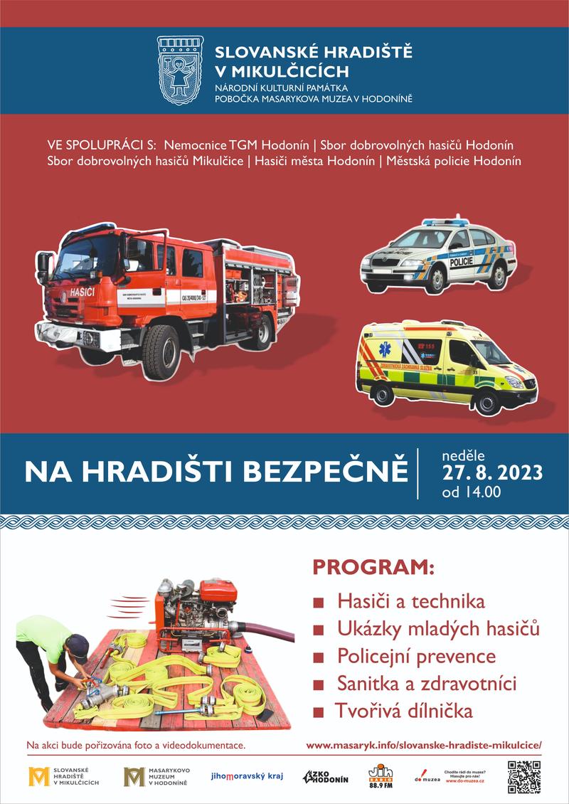 ODPOLEDNE PRO RODINY S DĚTMI A MLÁDEŽÍ, které bude zaměřené na různé aspekty BEZPEČNOSTI, ochranu zdraví, přírody i majetku. Téma bere ohled i na nadcházející začátek školního roku a pohyb dětí. Bude připraveno několik stanovišť s hasičskou technikou, ukázkou činnosti mladých hasičů, přítomni budou zdravotníci se sanitkou a s předváděním zákroků záchrany zdraví, rukodělná dílnička. Akce bude pořádána ve spolupráci s: Sbor dobrovolných hasičů Mikulčice, Sbor dobrovolných hasičů Hodonín, Hasiči města Hodonín, Nemocnice TGM Hodonín, Městská policie Hodonín - oddělení prevence. V areálu za budovou památníku bude 6 tematických stanovišť, které mohou děti a mládež navštěvovat a za aktivitu sbírat razítka do poskytnuté kartičky. Odměnou budou nejen shlédnuté činnosti a získané informace a dovednosti, ale i volný vstup na rozhlednu pro sebe a doprovod 1 dospělé osoby.