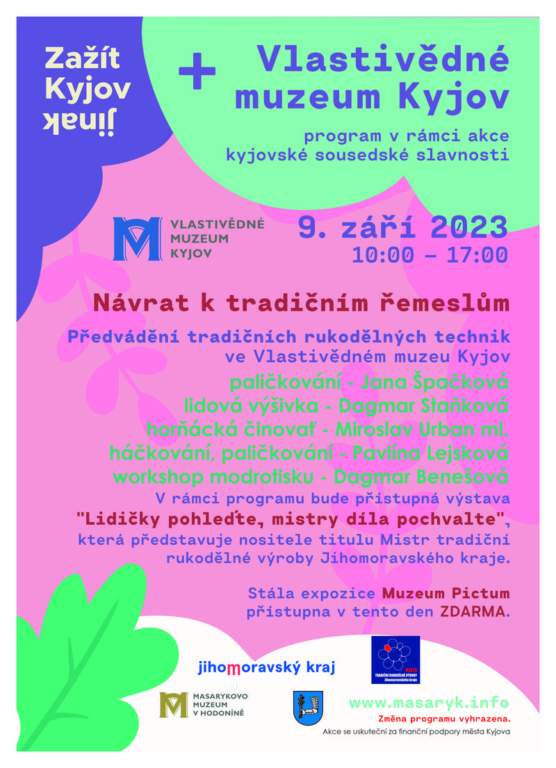 V rámci kyjovské sousedské slavnosti "Zažít Kyjov jinak" proběhne k výstavě "Lidičky pohleďte, mistry díla pochvalte" ve Vlastivědném muzeu Kyjov doprovodná akce "Návrat k tradičním řemeslům". Ukázka modrotisku - Dagmar Benešová, horňácké činovati - Miroslav Urban ml., lidové výšivky - Dagmar Staňková, paličkování - Jana Špačková a paličkování, háčkování - Pavlína Lejsková. Vstup na akci i na stálou expozici v sobotu 9. 9. 2023 ZDARMA. Akce se koná za finanční podpory města Kyjova.