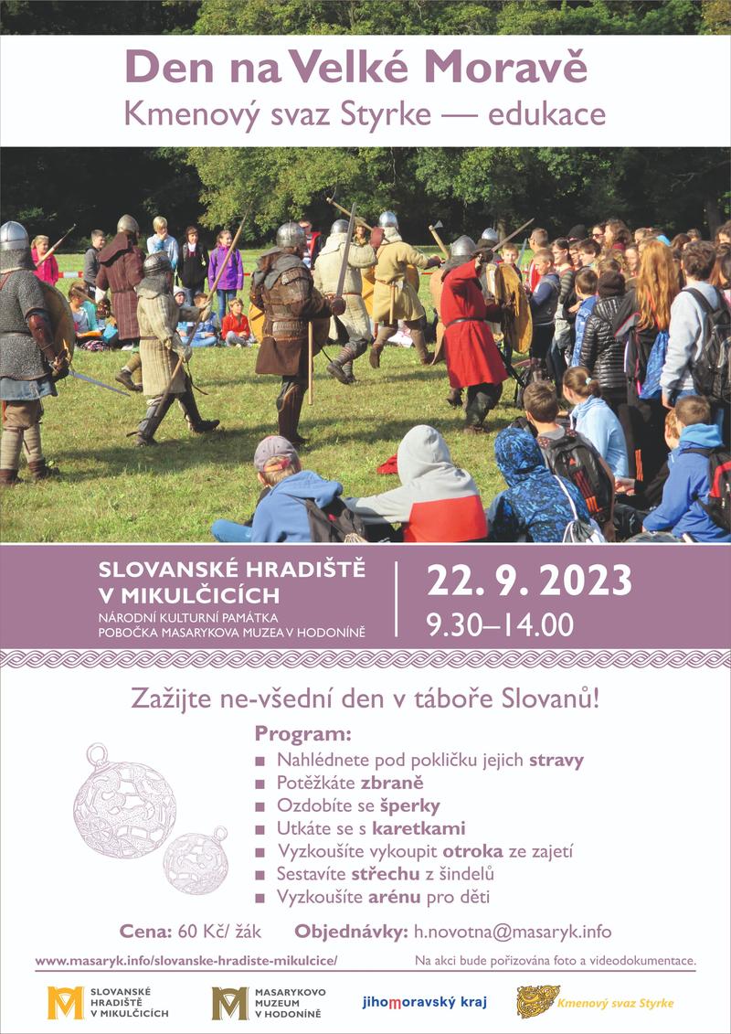 Programový den pro organizované ŠKOLNÍ SKUPINY s ukázkami dobové historie s "oživlými Moravany" z kmenového svazu Styrke. Akce probíhá především ve venkovním areálu za budovou návštěvnického centra, není určena pro širokou veřejnost, která se může podívat zpovzdálí nebo využít prohlídky muzea v 13, 14:30 a 16 hod. Naopak hlavně pro veřejnost a rodiny s dětmi je určena akce v následující 2 dny: dobové ARCHEOLOGICKÉ DNY.