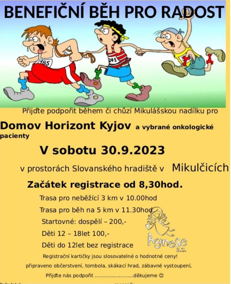 Benefiční běh na podporu uživatelů s tělesným postižením domova Horizont Kyjov. Proběhne v areálu a okolí Slovanského hradiště v Mikulčicích s trasami 3 km pro běžně neběžící a 5 km. Děti do 12 let bez registrace, děti od 12 do 18 let a starší s registrací. Výtěžek z akce bude použit na Mikulášskou a vánoční nadílku pro Domov Horizont a vybrané onkologické pacienty. Program ohledně atrakcí, zábavy a hudebního vystoupení bude ještě upřesněn.