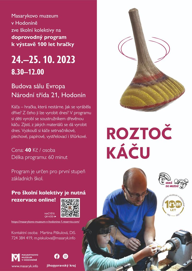 Masarykovo muzeum v Hodoníně zve školní kolektivy na doprovodný program k výstavě 100 let hračky ROZTOČ KÁČU! Akce se uskuteční v sále Evropa ve dnech 24.10. a 25.10. vždy od 8.30 do12.00. Délka trvání programu je 1 hodina a je určen I. stupni ZŠ.