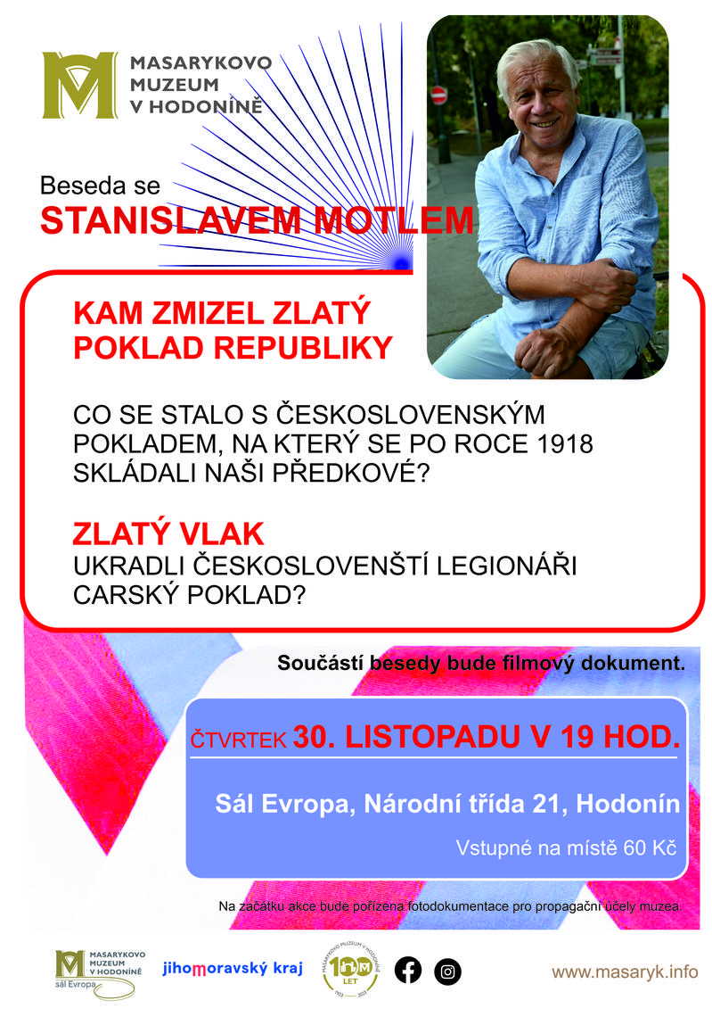 Beseda Kam zmizel zlatý poklad republiky a Zlatý vlak proběhne v sále Evropa 30. listopadu 2023 od 19 hodin. Stanislav Motl se s diváky podělí populární formou o dvě témata, která na sebe tematicky navazují a jsou spojená s problematikou československých legií a počátkem vzniku Československa. Zároveň jsou termínově vhodná do podzimní doby (28. říjen – vznik republiky, 11. listopad konec 1. světové války). V rámci besedy bude promítán také filmový dokument.
