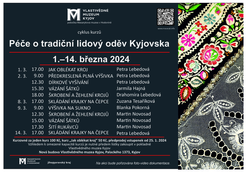Kurz vás seznámí s jednotlivými druhy kyjovských krojů, kombinacemi jednotlivých oděvních součástek a ukážeme si, jak správně kroj obléknout. Kurz je formou krátké přednášky a ukázky kompletního oblékání dívčího kroje s ukázkou oblékání některých součástek pánských. Pokud máte doma nějakou součástku/y, kterou nevíte k čemu můžete obléknout, tak ji vezměte sebou a poradíme vám.