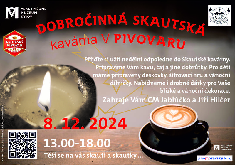 Přijďte si užít nedělní odpoledne do Skautské kavárny v KYJOVSKÉM PIVOVARU. Připravíme Vám kávu, čaj a jiné dobrůtky. Pro děti máme připraveny deskovky, šifrovací hru a vánoční dílničky. Nabídneme i drobné dárky pro Vaše blízké a vánoční dekorace. Zahraje Vám CM Jablúčko a Jiří Hilčer. Těší se na vás skauti a skautky...