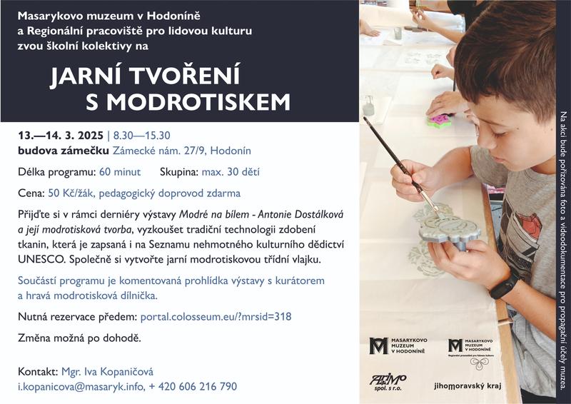 Přijďte si v rámci derniéry výstavy Modré na bílém - Antonie Dostálková a její modrotisková tvorba vyzkoušet tradiční technologii zdobení tkanin zapsanou i na Seznamu nehmotného kulturního dědictví UNESCO a společně si vytvořte jarní modrotiskovou třídní vlajku. Součástí programu je komentovaná prohlídka výstavy s kurátorem a hravá modrotisková dílnička.