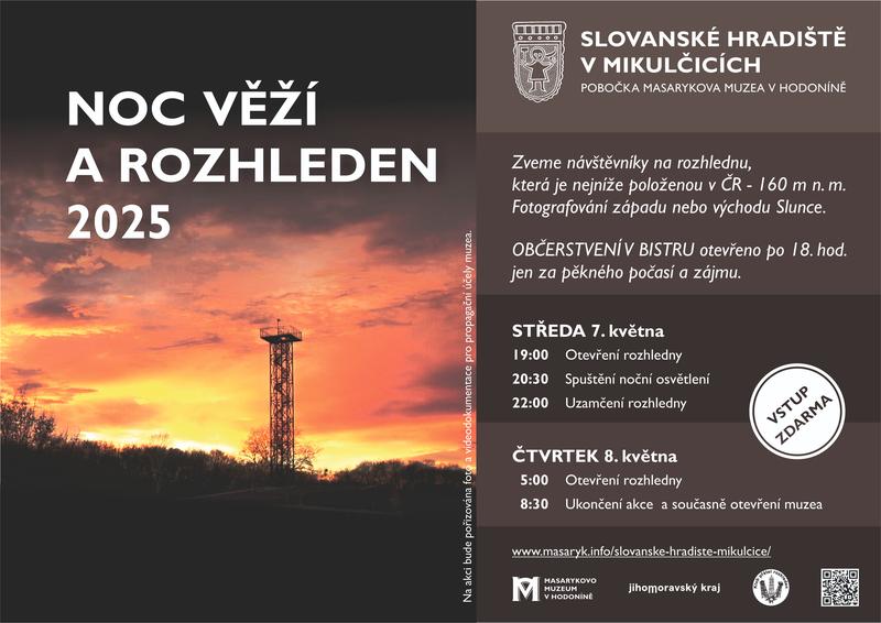 NOC ROZHLEDEN můžete oslavit na té nejníže položené rozhledně v ČR (nadmořská výška 160 m n.m.) - u Mikulčic v přírodním parku Mikulčický luh a ve významné archeologické lokalitě. Večerní OTEVŘENÍ ROZHLEDNY ZDARMA bude od 19 do 22 hod., BISTRO s občerstvením v případě pěkného počasí zůstane v provozu i po 18. hod. Rozhledna nabízí výhledy jak na areál s pozůstatky hradiště z 9. stol., tak do okolí (Mikulčice, Lužice, Holíč, Kopčany apod.) a při pěkném počasí i na horizont (Strážovský vrch, Bílé Karpaty s Velkou Javořinou, Malé Karpaty,...). Po 20. hodině zapneme noční osvětlení věže a při vhodném počasí bude možnost pozorování a fotografování západu Slunce zde, z výšky 30 m. Pro ranní ptáčata a v případě vhodnějšího počasí ráno otevřeme po 5. hodině kvůli východu Slunce. Je to opět ZDARMA a plynule přejdeme do otevření muzea v 8:30 hod. již za peníze. Několik fotografií z minulého ročníku zde (adresu vykopírovat do prohlížeče ručně): https://www.masaryk.info/akce/1538/