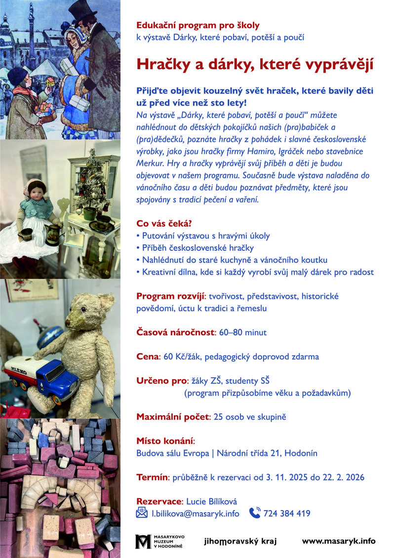 Na výstavě „Dárky, které pobaví, potěší a poučí“ můžete nahlédnout do dětských pokojíčků našich (pra)babiček a (pra)dědečků, poznáte hračky z pohádek i slavné československé výrobky, jako jsou hračky firmy Hamiro, Igráček nebo stavebnice Merkur. Hry a hračky vyprávějí svůj příběh a děti je budou objevovat v našem programu. Současně bude výstava naladěna do vánočního času a děti budou poznávat předměty, které jsou spojovány s tradicí pečení a vaření.