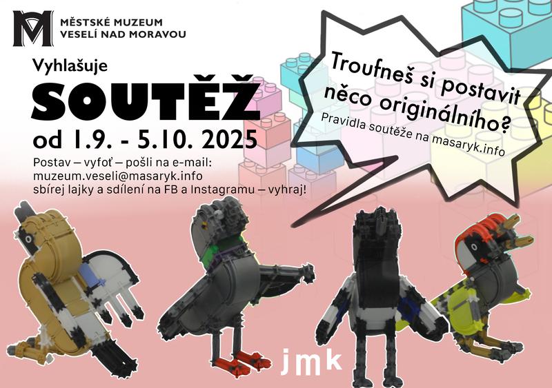 Postav cokoliv, co Tě napadne, vyfoť svůj výtvor a pošli fotografii na e-mail muzeum.veseli@masaryk.info (uveďte jméno, příjmení a věk). Tvůj snímek bude následně zveřejněn na Facebooku a Instagramu muzea. Hlasování proběhne prostřednictvím „lajků“ a sdílení na obou platformách – tři nejoblíbenější stavby získají odměnu.