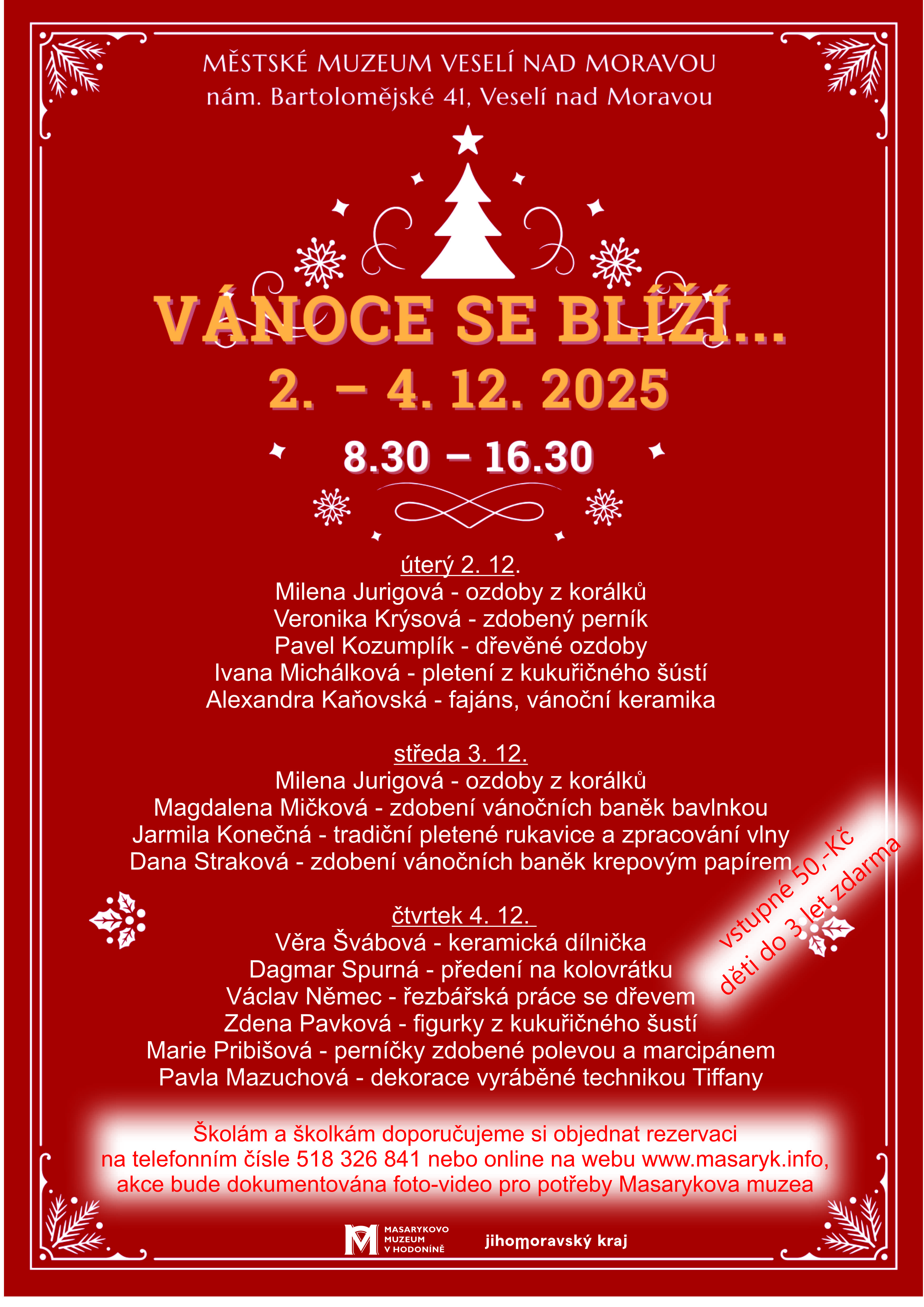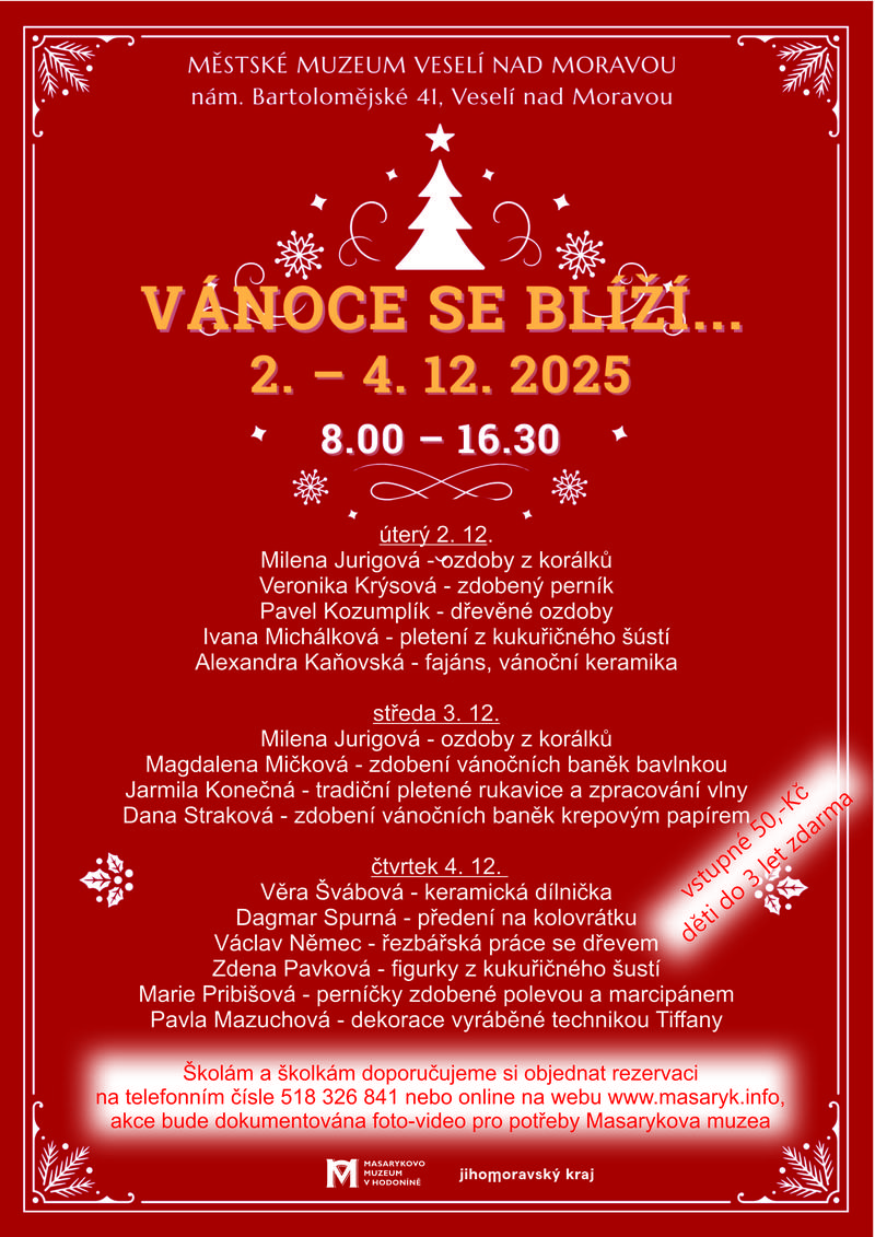 Městské muzeum Veselí nad Moravou vás srdečně zve na tradiční adventní akci Vánoce se blíží, která přinese kouzelnou atmosféru blížících se svátků s ukázkou vánočních řemesel. ✨
