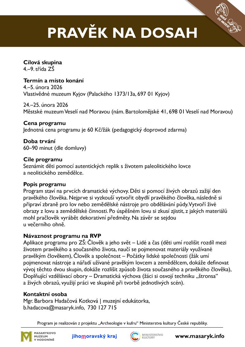 Popis programu: Program staví na prvcích dramatické výchovy. Děti si pomocí živých obrazů zažijí den pravěkého člověka. Nejprve si vyzkouší vytvořit obydlí pravěkého člověk, následně si připraví zbraně pro lov nebo zemědělské nástroje pro obdělávání půdy. Vytvoří živé obrazy z lovu a zemědělské činnosti.
