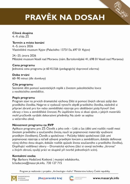 Program staví na prvcích dramatické výchovy. Děti si pomocí živých obrazů zažijí den pravěkého člověka. Nejprve si vyzkouší vytvořit obydlí pravěkého člověka, následně si připraví zbraně pro lov nebo zemědělské nástroje pro obdělání půdy. Vytvoří živé obrazy z lovu a zemědělské činnosti. Po úspěšném lovu si zkusí zjistit, z jakých materiálů mohl pračlověk vyrábět dekorativní předměty. Na závěr se sejdou u večerního ohně.