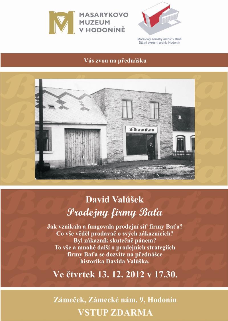 Státní okresní archiv Hodonín a Masarykovo muzeum v Hodoníně si připravili pro všechny milovníky historie vánoční dárek v podobě přednášky Davida Valůška s názvem Prodejny firmy Baťa. Historik, ředitel Státního okresního archivu Zlín Mgr. David Valůšek přiblíží zájemcům z řad široké veřejnosti prodejní strategii známé, původně české obuvnické firmy Baťa, která začala se svým budováním prodejní sítě již na sklonku první světové války a do konce roku 1918 založila čtyřicet šest prodejen, kdy dokonce první poválečná prodejna byla zřízena v Hodoníně na náměstí.