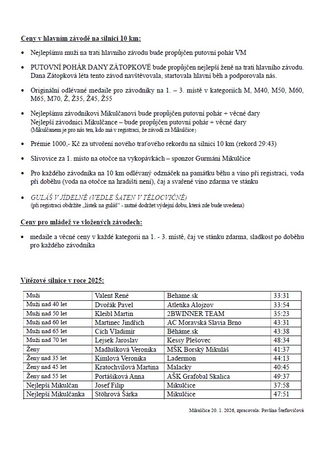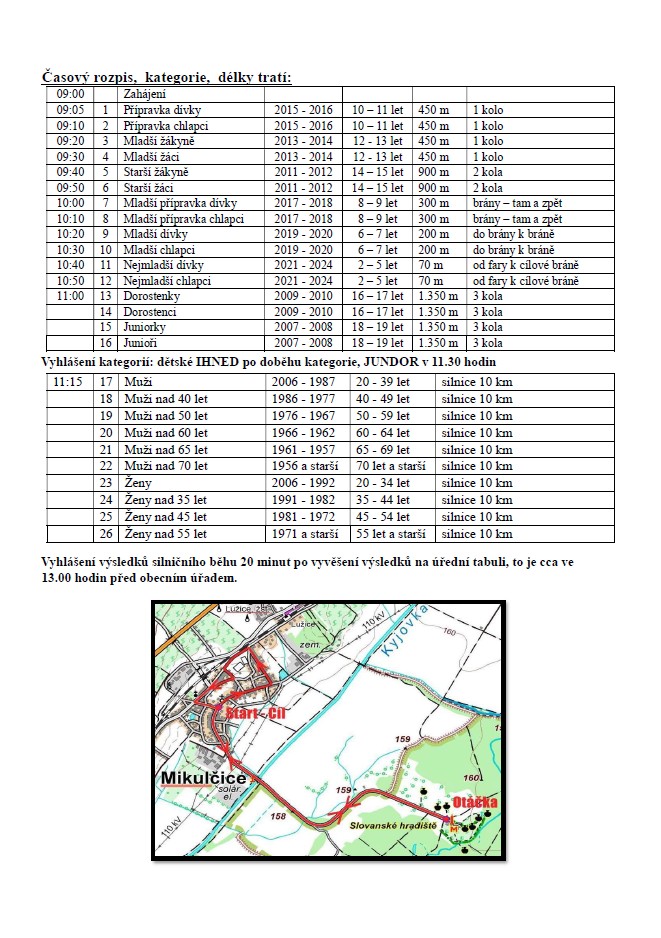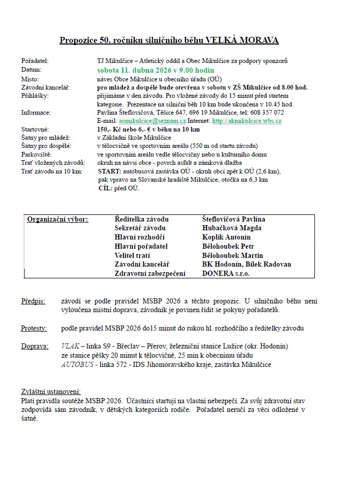 Zveme zájemce na jubilejní 50. ročník silničního běhu pro děti, mládež a dospělé. Příjem přihlášek je v sobotu od 8 hod. v ZŠ Mikulčice. Starty na tratích jsou průběžně od 9 hod. z prostoru před OÚ Mikulčice. Je připraveno množství medailí, cen, občerstvení a také pro každého účastníka pamětní odznáček. Při překonání rekordu na 10 km (dosavadní je 29 min. 43 s) obdrží vítěz prémii 1000,- Kč a 1 rychlostní prémie je už v mezičase v místě otočky na Slovanském hradišti, a to slivovice od Gurmánů z Mikulčic. DŮLEŽITÉ UPOZORNĚNÍ - OMEZENÍ DOPRAVY: V sobotu od 9 do 12 hod. bude UZAVŘENA náves obce Mikulčice. Po 11. hod. poběží peloton dospělých už po příjezdové cestě ke Slovanskému hradišti a zpět. Proto zde bude VÝRAZNĚ OMEZENA popř. UZAVŘENA příjezdová komunikace. VIZ PODROBNOSTI v přiloženém dokumentu propozic závodu.