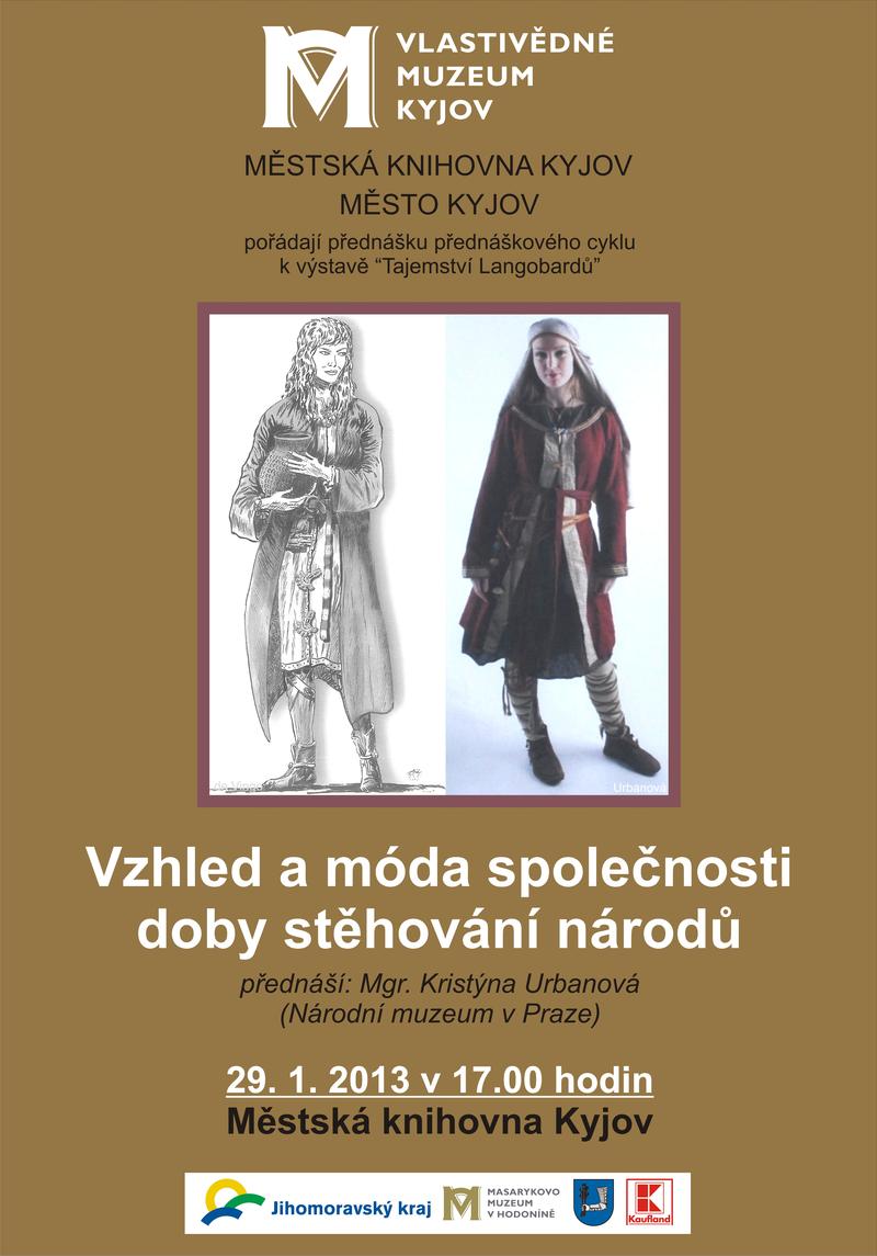 Dne 29.1. 2013 srdečně zveme zájemce o přenášku z cyklu přednášek k výstavě "Tajemství Langobardů" v 17.00 do Městské knihovny v Kyjově. Přednáší: Mgr. Kristýna Urbanová (Národní muzeum v Praze) téma přednášky "Vzhled a móda společnosti doby stěhování národů".