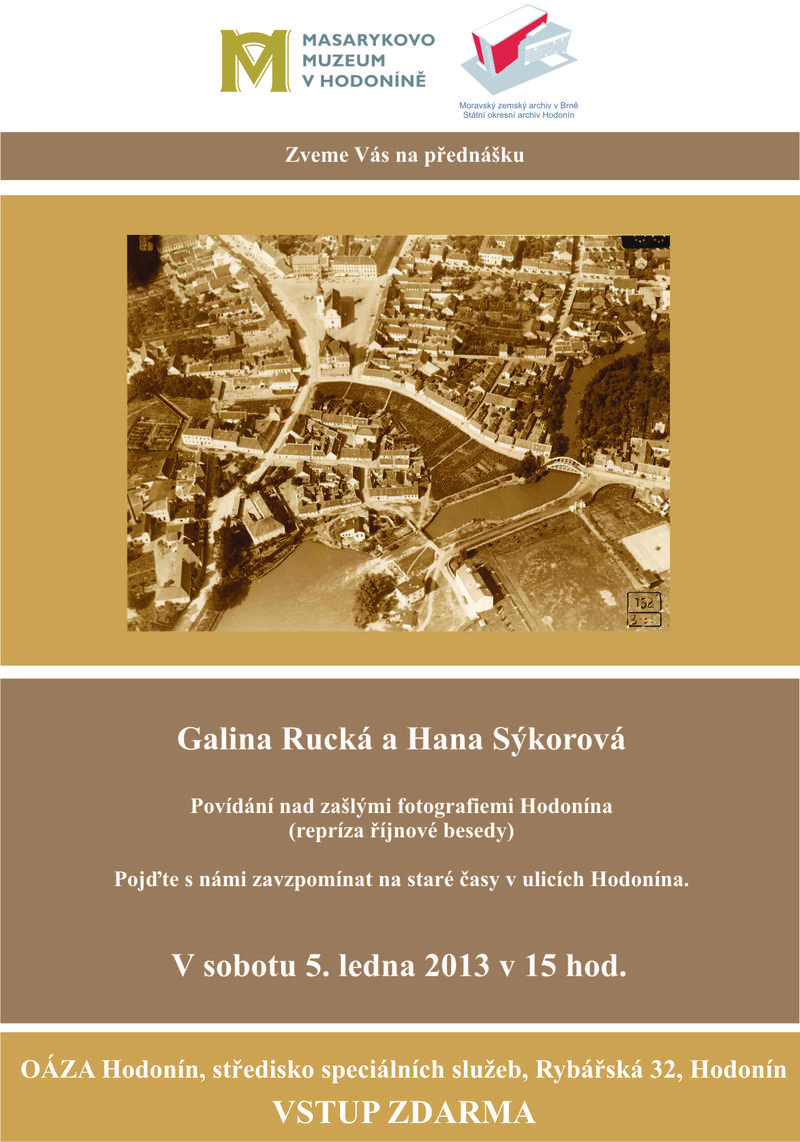 Povídání nad zašlými fotografiemi Hodonína si pro zájemce o historii Hodonína opět připravily Galina Rucká (Státní okresní archiv Hodonín) a Hana Sýkorová (Masarykovo muzeum v Hodoníně). Jedná se reprízu říjnové přednášky, která proběhla v Městské knihovně Hodonín. Nyní se přednáška uskuteční v Oáze Hodonín, středisku speciálních služeb (ulice Rybářská 32, Hodonín). Akce proběhne v sobotu 5. ledna 2013 v 15 hodin. Všichni jsou vítáni, vstup je zdarma.