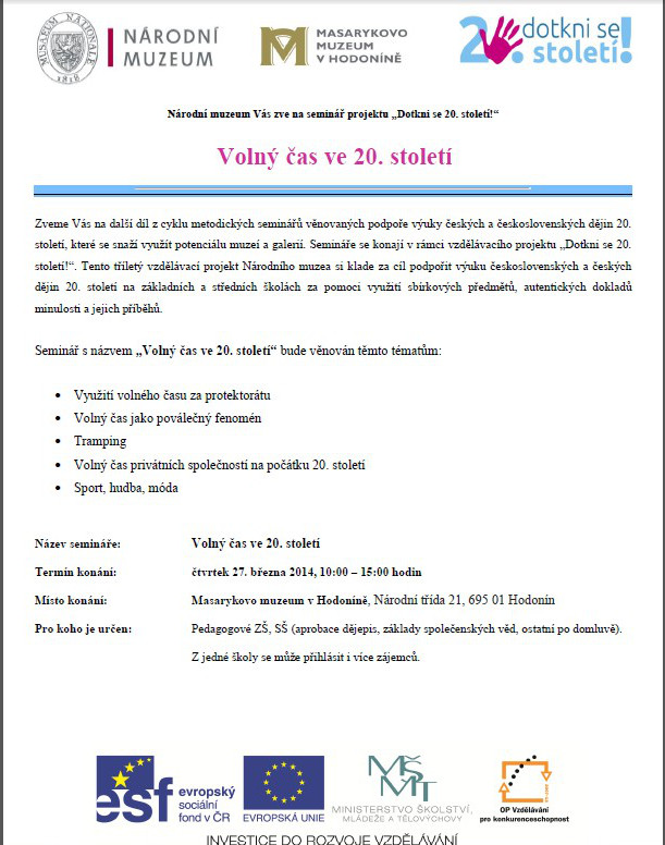 V rámci tříletého vzdělávacího projektu Národního muzea Dotkni se 20. století!, který je spolufinancován z Evropského sociálního fondu a státního rozpočtu České republiky, bychom Vás rádi pozvali na další seminář, pořádaný ve spolupráci s naším Masarykovým muzeem v Hodoníně, tentokrát s názvem "Volný čas ve 20. století".