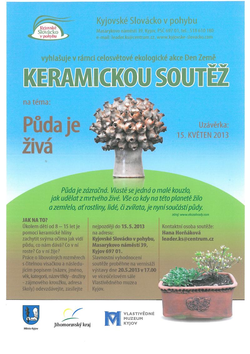 Výstava prací z keramické soutěže "Půda je živá", kterou vyhlásilo Kyjovské Slovácko v pohybu v rámci celosvětové ekologické akce Den Země. Vernisáž výstavy se uskuteční 20. 5. 2013 v 17.00 hodin.
