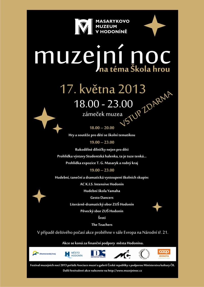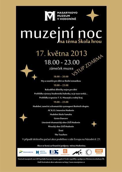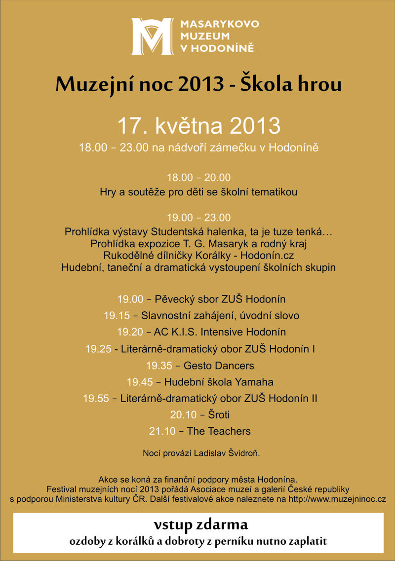 I v letošním roce se naše muzeum zapojí do celorepublikového Festivalu muzejních nocí. Muzejní noc se jako již tradičně bude odehrávat na nádvoří hodonínského zámečku. Od 18:00 do 23:00 je zde připraven zajímavý kulturní program a animační programy pro děti plné soutěží a her. Letošní ročník jsme připravili na téma Škola hrou...jak se dříve učilo a chodilo do školy. Námět muzejní noci úzce souvisí s právě probíhající výstavou z historie školství na Hodonínsku - Studentská halenka, ta je tuze tenká.... Akci pořádáme za finanční podpory města Hodonína. Podrobnější informace naleznete v plakátu.