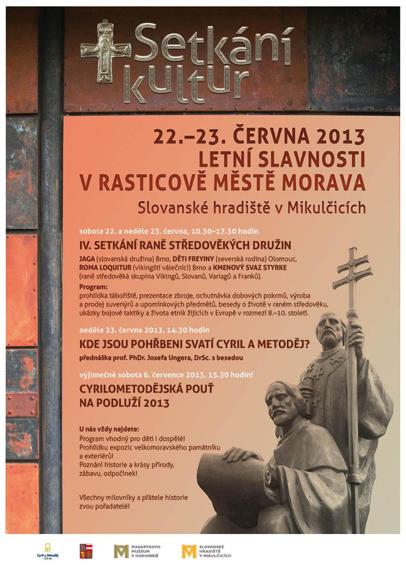 Dvoudenní poznávací a zábavný program sestávající ze setkání členů skupin raného středověku a přednášky prof. dr. J. Ungera na téma: Kde jsou pohřbeni ss. Cyril a Metoděj. Slavnost se koná 22. a 23. června.