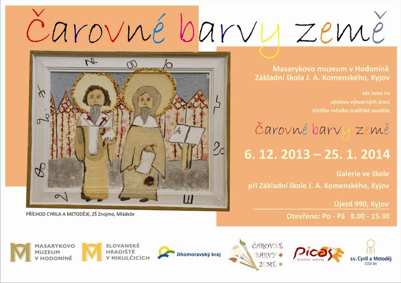 Od 6. prosince 2013 se v Galerii ve škole při ZŠ J. A. Komenského v Kyjově uskuteční výstava výtvarných prací Čarovné barvy země. Jedná se o výstavu soutěžních prací školních kolektivů, vytvořených pomocí přírodních barevných jílů a dalších čistě přírodních materiálů. Soutěž, nesoucí stejný název jako připravovaná výstava, probíhala v tomto školním roce nejen v našem regionu, ale i v příhraničí a zapojilo se do ní 20 škol, které soutěžily ve čtyřech věkových kategoriích. Hlavním motivem celé soutěže je letošní Cyrilometodějské jubileum, které je úzce spjato se Slovanským hradištěm v Mikulčicích, garantem této soutěže. Témata těchto kategorií nesou názvy Půda jako kronika (patroni Evropy sv. Cyril a Metoděj) a Obrazy z dějin (Magnae Moraviae). Dvě nejmladší kategorie vytvořily díla na téma Okouzleni přírodou (otisk přírody) a Svět kolem nás (pramen života). Základní, základní umělecké a střední školy vytvořily celkem 69 děl, které byly vyhodnoceny odbornou porotou. Slavnostní vyhlášení výsledků soutěže proběhlo 13. června 2013 na Slovanském hradišti v Mikulčicích. Vítězné práce spolu s dalšími soutěžními obrázky si budou moci návštěvníci prohlédnout do 25. ledna 2014.