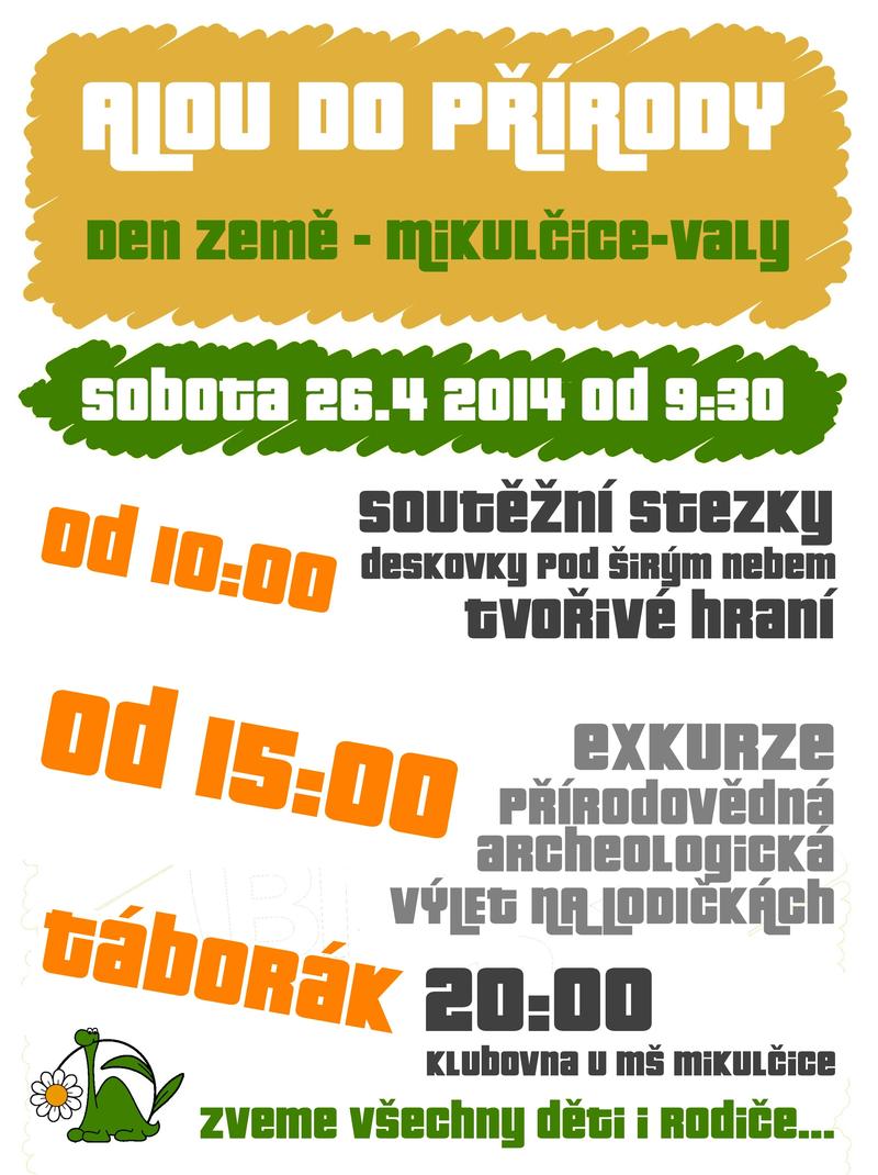 Za netradiční zábavou, poznáním a zápolením v nejen přírodovědných soutěžích, vyrazí na jih Moravy děti ze všech koutů tuzemska. Mladí ochránci přírody se čtvrtý dubnový víkend setkají v areálu mikulčického památníku Velké Moravy. Společně s veřejností tam oslaví Den Země. Alou do přírody. Takový podtitul dali letošnímu setkání jeho pořadatelé z Hnutí Brontosaurus, Brdo Vlkani. Už sedmnáct let na akci nabízí pestrý program pro děti, jejich rodiče a další zájemce z okolí. Jeho cílem je přiblížit konkrétní oblasti přírody a její ochrany. Proto probíhá část soutěžních stezek v unikátním lužním lese rezervace Mikulčický luh. Lidé mohou vyrazit do lužního lesa ověřit své znalosti o jeho zvířecích obyvatelích, v improvizovaném lanovém centru zdolat některé z překážek, svézt se na lanovce, nebo třeba zkusit folklorní stezku. Další aktivity propojí téma vzduch, chybět nebude ani tvoření z přírodnin a další zajímavosti.