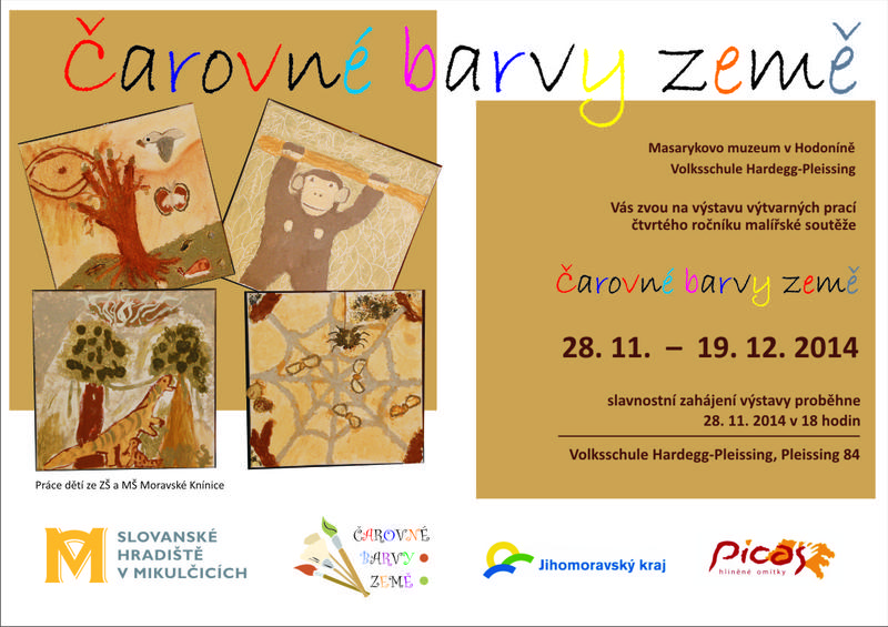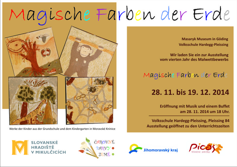 Od 28. listopadu 2014 se v prostorách Základní školy Hardegg Pleissing uskuteční výstava výtvarných prací Čarovné barvy země. Jedná se o výstavu soutěžních prací školních kolektivů, vytvořených pomocí přírodních barevných jílů a dalších čistě přírodních materiálů. Soutěž, nesoucí stejný název jako připravovaná výstava, probíhala v minulém školním roce převážně v Jihomoravském kraji a zapojilo se do ní 31 škol, které soutěžily ve čtyřech věkových kategoriích. Mateřské, základní, základní umělecké a střední školy vytvořily celkem 110 děl, které byly vyhodnoceny odbornou porotou. Slavnostní vyhlášení výsledků soutěže proběhlo 11. června 2014 na Slovanském hradišti v Mikulčicích. Vítězné práce spolu s dalšími soutěžními obrázky si budou moci návštěvníci prohlédnout do 19. prosince 2014.