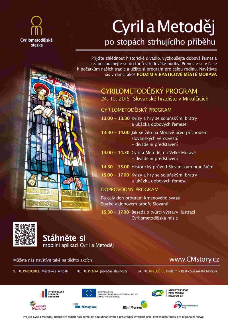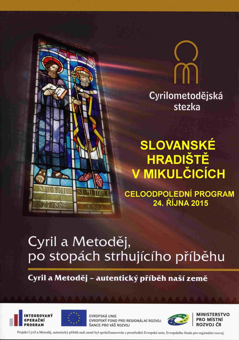 V sobotu od 13.00 hodin vás zveme na kulturní doprovodný program k projektu Centrál cestovního ruchu Jižní a Východní Moravy s názvem Cyril a Metoděj - po stopách strhujícího příběhu. Celoodpolední program zahrnuje celou řadu zajímavých programů a aktivit spojených s osobnostmi svatých soluňských bratří a seznamujících s jejich bohatým životem a osudy. Bližší informace k programu naleznete na adrese: www.CMstory.cz. Současně si můžete prohlédnout výstavu ilustrací s názvem Misie v kontextu a souvislostech, která zajímavě prezentuje významná místa s cyrilometodějskou a velkomoravskou tradicí na Moravě a Slovensku.