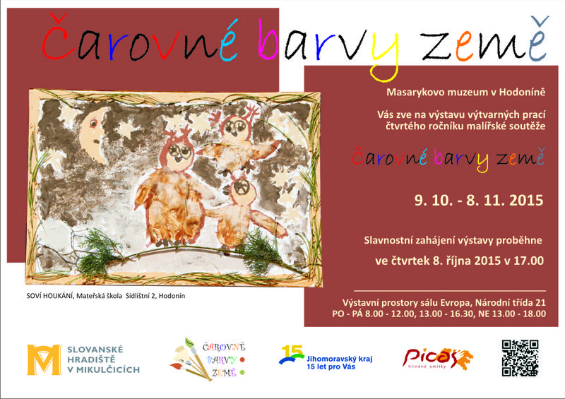 Srdečně Vás zveme na výstavu dětských a studentských malířských prací pátého ročníku soutěže Čarovné barvy země. Vernisáž výstavy se uskuteční 8. října 2015 v 17 hodin ve výstavních prostorách budovy sálu Evropa v Hodoníně, kde budou moci návštěvníci zhlédnout všech 105 malířských děl školních kolektivů zapojených do soutěže. Výjimečností projektu je práce pouze s čistě přírodními materiály - barevnými hliněnými jíly a přírodninami. Organizátorem soutěže je Masarykovo muzeum v Hodoníně a vyhlašovatel soutěže je Jihomoravský kraj, jehož zástupci zahájí na této vernisáži již 6. ročník soutěže Čarovné barvy země.