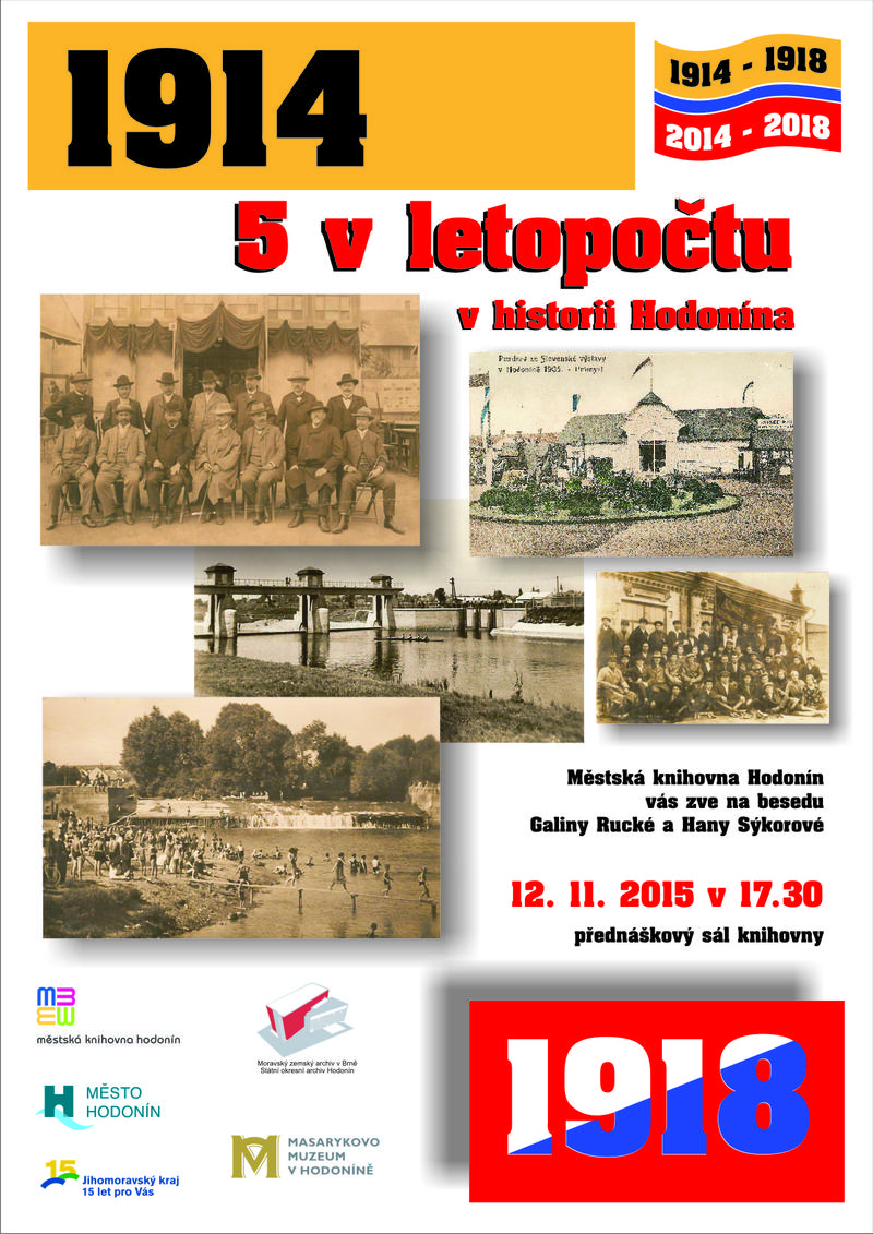Ve spolupráci Masarykova muzea v Hodoníně, Státního okresního archivu Hodonín a Městské knihovny Hodonín si mohou zájemci připomenout zajímavé události, které se uskutečnily v Hodoníně v letech zakončených číslem 5. Beseda s názvem Pětka v letopočtu v historii Hodonína navazující na loňskou besedu s číslem čtyři připomene nejen události přesně před sto lety spojené s první světovu válkou, tedy v roce 1915, ale také konání Slovenské výstavy v Hodoníně v roce 1905, vznik hospodářského družstva Slovácká komuna a odjezd jeho členů do Ruska v listopadu 1925, zprovoznění pohyblivého jezu a zasypání Rybářského ramene na řece Moravě v roce 1935 či události spjaté s osvobozením města a návštěvu prezidenta Edvarda Beneše v Hodoníně v roce 1945. Beseda s promítáním dobových fotografií se uskuteční v sále Městské knihovna v Hodoníně 12. listopadu 2015 o půl šesté odpoledne. Slovem budou provázet Galina Rucká ze Státního okresního archivu Hodonín a a Hana Sýkorová z Masarykova muzea v Hodoníně.