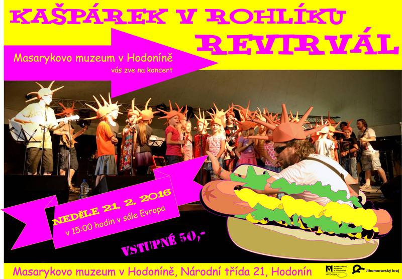Dobrý den, dovolujeme si Vás i Vaše děti pozvat na neopakovatelný zážitek – zábavný koncert KAŠPÁREK V ROHLÍKU REVIRVÁL dětského sboru z Kyjova v bláznivé hudební show pro děti. Akce proběhne v neděli 21. února 2016 od 15:00 hod. v budově Sálu Evropa na Národní tř. 21 v Hodoníně