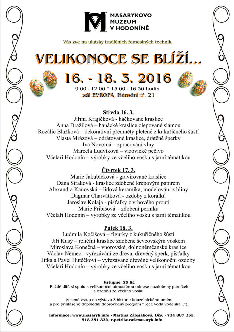 Srdečně zveme všechny návštěvníky na tradiční předváděcí akci spojenou s prodejem Velikonoce se blíží..., která se uskuteční ve dnech 16.-18.3.2016 v budově Sálu Evropa na Národní třídě 21. Během tří dnů se v sále Evropa vystřídá osmnáct předvádějících. Součástí programu bude doprovodný zvykoslovný program na téma ''Teče voda voděnka...''. Pro školky a školy doporučujeme objednat termín návštěvy na tel. čísle: 724 887 255. Každé dítě si spolu s velikonoční atmosférou odnese i dáreček