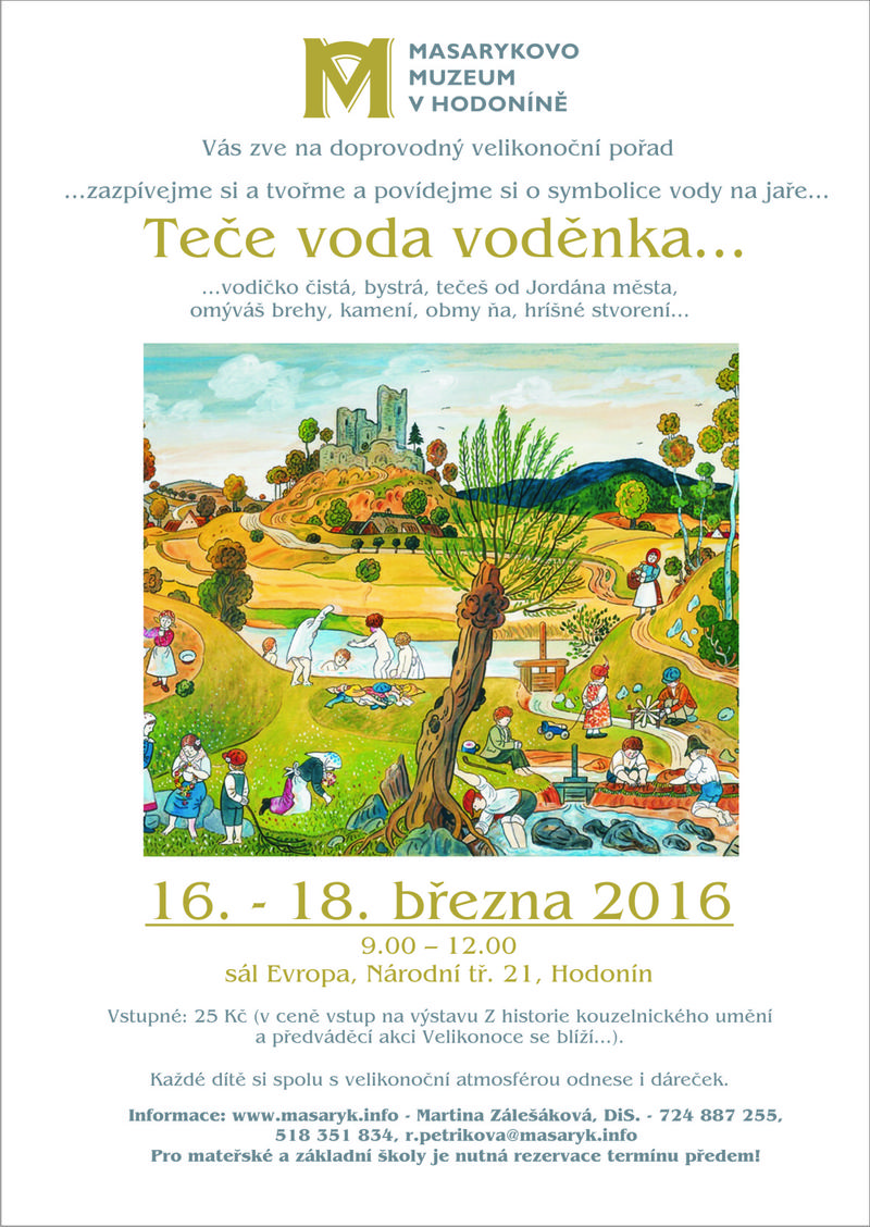Pro školky a školy se bude konat v rámci předváděcích akcí Velikonoce se blíží... doprovodný zvykoslovný program pro děti na téma ''Teče voda voděnka...''. Pro školky a školy je nutná rezervace na tel. čísle 724 887 255 nebo emailem na: r.petrikova@masaryk.info