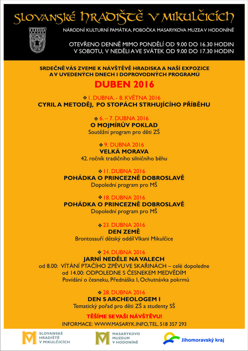 Představujeme vám jednotlivé programové typy, které připravujeme na první návštěvní měsíc duben. K jednotlivým pořadům budeme ještě vydávat samostatné programové plakáty. Věříme, že si z bohatého programu vyberete a hradiště navštívíte.