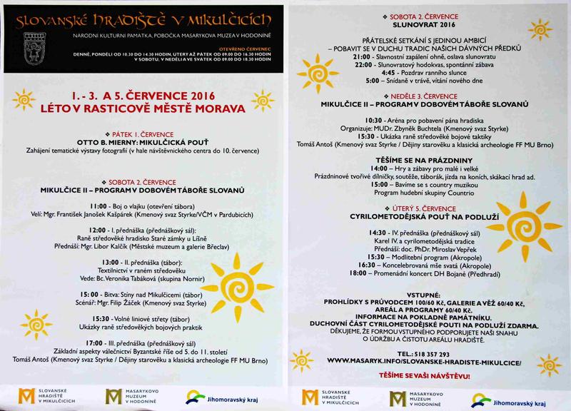 Vrcholný programový víkend uzavírající první polovinu 56. návštěvní sezóny 2016 nese název Léto v Rasticově městě Morava. Ve svém třídenním programovém obsahu přináší celou řadu velmi zajímavých a podnětných pořadů pro všechny věkové kategorie našich hostů i pro jejich různé zájmy. Věříme, že si naši hosté z bohaté nabídky vyberou ten svůj top program a hradiště v hojném počtu navštíví. Celému víkendu pak dominuje Cyrilometodějská pouť na Podluží ve státní svátek 5. července.