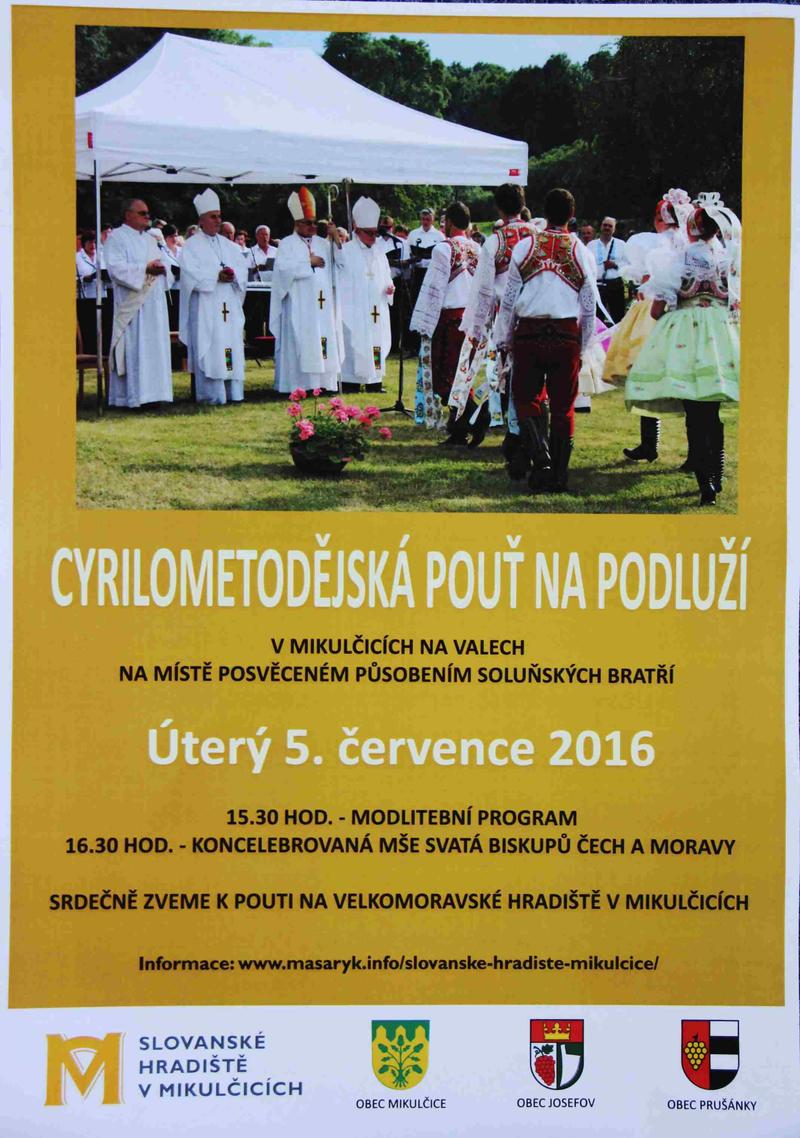 Slavnostní koncelebrovaná římskokatolická poutní mše svatá s účastí biskupů, kněží a více než jedno a půl tisíce poutníků, z nichž přichází řada v krásných slováckých krojích. Organizace pouti se letos ujaly obce Mikulčice, Josef a Prušánky. Součástí odpoledního programu je přednáška dr. M. Vepřeka k výročí Karla IV. o jeho vztahu k cyrilometodějské tradici a závěrečný promenádní koncert dechové hudby Bojané. Srdečně zveme k duchovnímu osvěžení, poznání i zábavě.