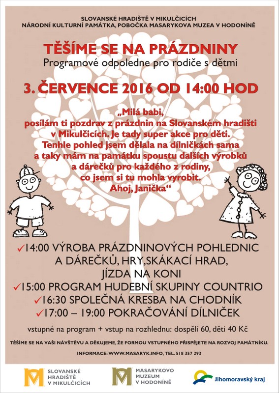 Odpoledne pro rodiče s dětmi plné soutěží, dílniček (tvorba prázdninových pohlednic a dárečků) a zábavy (hudební vystoupení, malování na obličej, jízda na koni, skákací hrad, soutěže aj.)