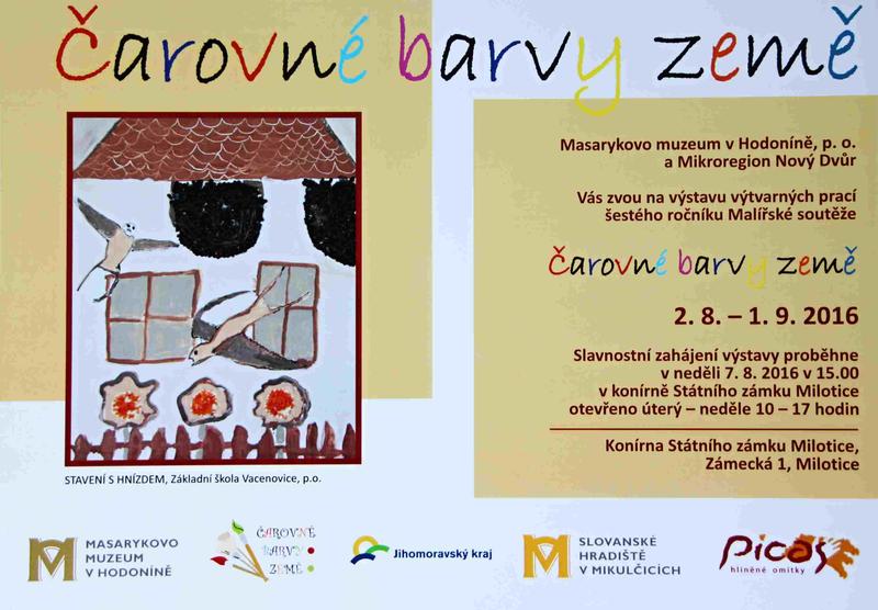 Putovní výstava malířských prací VI. ročníku Malířské soutěže Čarovné barvy země se z Mikulčic přesunula do prostor Infocentra Konírna ve Státním zámku Milotice. V prostorách centra Mikroregionu Nový Dvůr můžete od 2. srpna do 1. září 2016 obdivovat výběr prací zahrnující vítězné obrazy a díla dětských tvůrců ze škol obcí mikroregionu a blízkého okolí. Slavnostní otevření výstavy doprovázené dílničkami pro malé návštěvníky, při nichž si děti budou moci vyzkoušet práci s přírodními jíly i pojivy, se uskuteční v neděli 7. srpna od 15 hodin. Přijďte se osvěžit krásou dětského vidění světa. - hn -