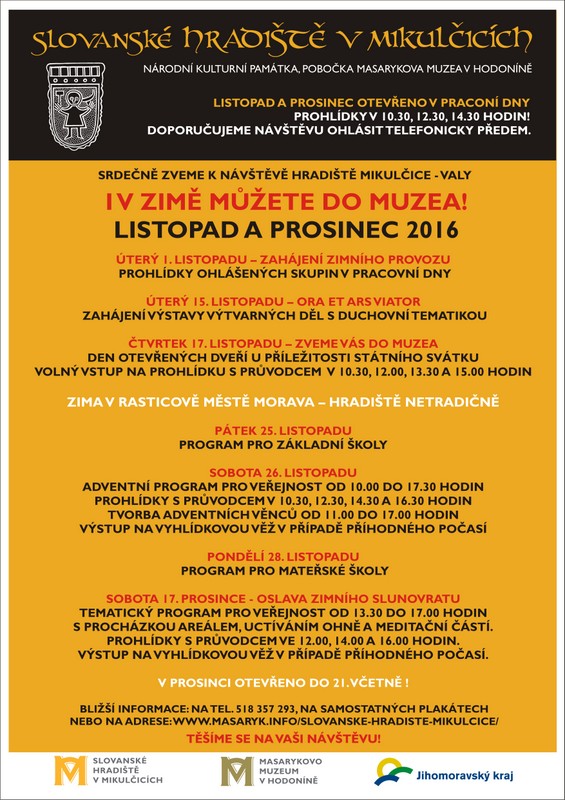 Srdečně Vás zveme na programové aktivity připravené naším kolektivem na poslední týdny letošního roku v rámci zimní provozní doby. Ve vybraných dnech Vám nabízíme zajímavý a netradiční program, který může obohatit Váš předvánoční čas. Prosím, seznamte se s naším programovým menu. Zaujme-li Vás některá akce, neváhejte a přijeďte. Rádi Vás uvítáme. :-)
