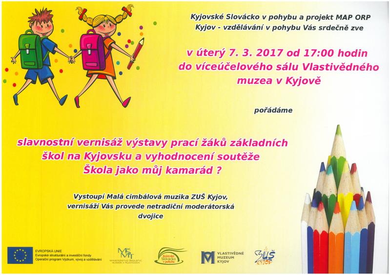 Vernisáž výstavy soutěžních prací dětí ze ZŠ na Kyjovsku. Zahájení výstavy a vyhodnocení soutěže ŠKOLA JAKO MŮJ KAMARÁD? se uskuteční v úterý 7. 3. 2017 v 17.00 hodin.