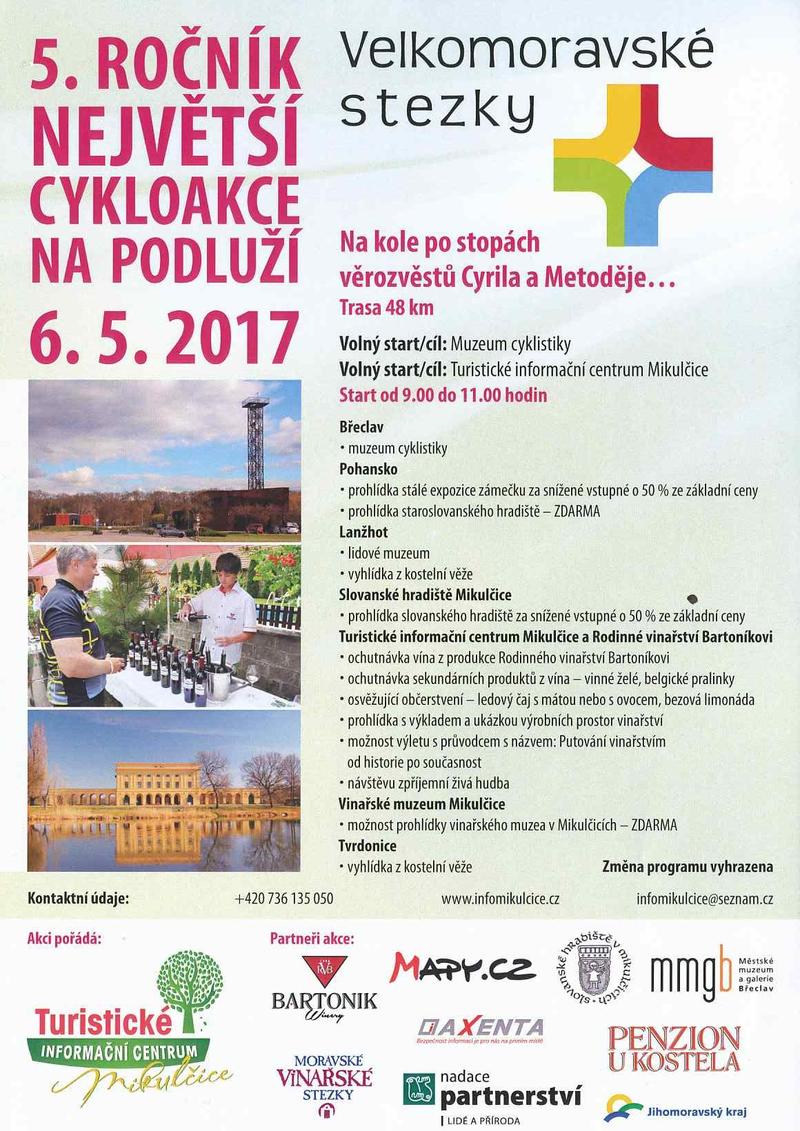 Také naše hradiště se v sobotu 6. května stane místem, kudy povede trať 5. ročníku největší cykloakce na Podluží s názvem Velkomoravské stezky. Celá plánovaná trasa měří 48 km a volné starty jsou v Břeclavi a Mikulčicích. Na trati lehkého profilu jsou velmi zajímavá místa: Břeclav - Pohansko - Lanžhot - Mikulčice / hradiště, Mikulčice / informační centrum, Mikulčice / vinařské muzeum a Tvrdonice. Přijměte pozvání a projížďku i návštěvu expozic, vyhlídkové věže a areálu našeho hradiště. Velmi se na vás těšíme. :-) -fs-