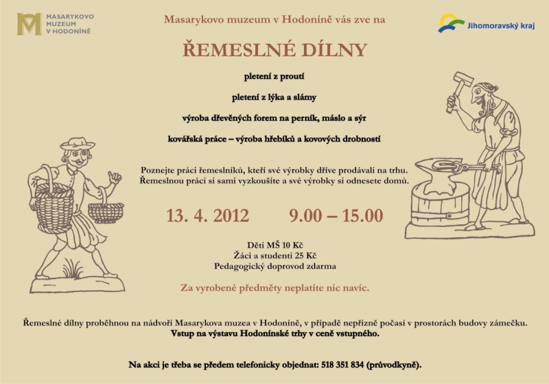 Hodonínské pracoviště zve na doprovodnou akci Řemeslné dílny, která se uskuteční v pátek 13. 4. 2012 od 9:00 do 15:00. Na nádvoří zámečku uvidíte a vyzkoušíte si kovářské práce, pletení z proutí, pletení z lýka a slámy a výrobu dřevěných forem na perník, máslo a sýr. Podrobnější informace naleznete v letáku.
