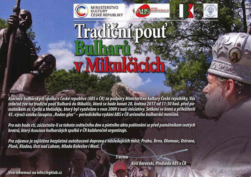 Asociace bulharských spolků v ČR za podpory Ministerstva kultury ČR pořádá v našem areálu v sobotu 20. května 2017 již Tradiční pouť Bulharů v Mikulčicích. Vlastní kulturní program u sousoší svatých bratří Cyrila a Metoděje začíná ve 11.30 hodin. Předchází mu Pravoslavná cyrilometodějská pouť se svatou liturgií, která v prostorách III. mikulčického kostela - baziliky bude zahájena v 10.30 hodin. Večer pak programový den pokračuje Muzejní nocí kostelů s bohatým programem, včetně noční návštěvy dobového tábora Kmenového svazu Styrke. Přijeďte, budete vítáni a věříme, že i spokojeni. :-) -fs-