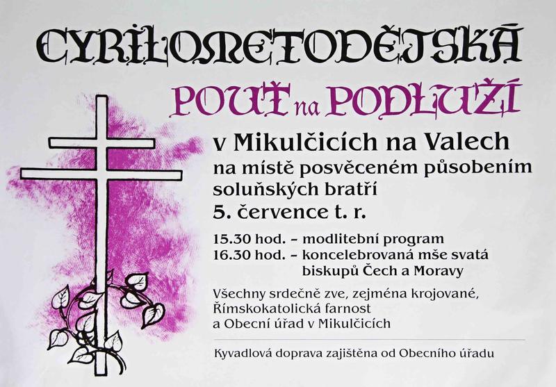 Na přípravě tradiční Cyrilometodějské pouti na Podluží se letos podílí kromě obce a farnosti Mikulčice také Město Hodonín. Koncelebrované mše svaté se zúčastní biskupové a kněží z celé České republiky a stovky poutníků z celého Podluží i přilehlých částí Slovácka, mnozí z nich v krásných svátečních krojích. Mši svaté předchází modlitby a duchovní zpěvy. Začátek slavnosti, jež se koná na Akropoli hradiště u cyrilometodějského kříže je v 15.30 hodin.